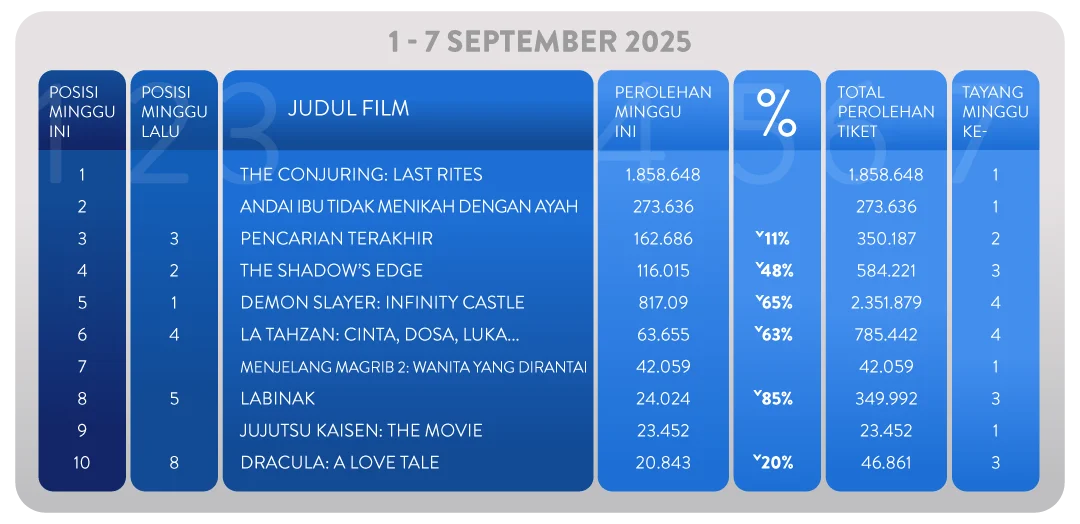 Halo sobat setia pecinta film. Siapa sangka, ternyata kita sudah semakin mendekati akhir dari tahun 2025 dan sudah memasuki bulan September. Di awal bulan ini, juga sudah banyak nih, film baru yang tengah meramaikan bioskop tanah air. Seperti biasa, TIX ID sudah menyiapkan jajaran film yang berhasil mencuri perhatian di minggu lalu. Langsung simak daftarnya berikut ini ya!