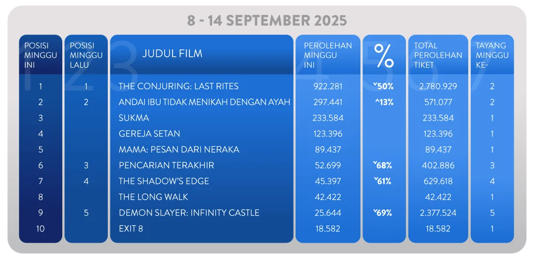 Berikut adalah 10 film terlaris di bioskop selama periode 8 hingga 14 September. Film mana yang berhasil mencuri perhatian? Simak daftarnya berikut ini!