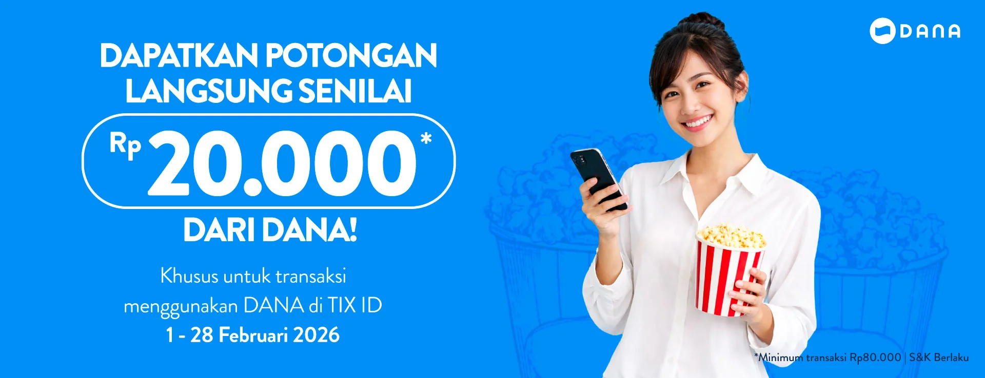 Dapatkan diskon langsung Rp 20.000 untuk semua pengguna yang melakukan transaksi menggunakan DANA di mini web dan aplikasi TIX ID